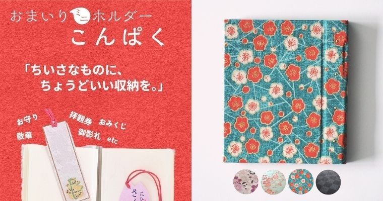 「ちいさなものに、ちょうどいい収納を。」おみくじ、お守り、散華、拝観券、etc…御朱印めぐりでたまっていく‘‘ちいさなものたち‘‘。ついうっかりカバンの中でくしゃくしゃになってしまうことも…そんな時、おまいりミニホルダー「こんぱく」があれば、お寺や神社で手に入る小物類をスマートに収納できます!