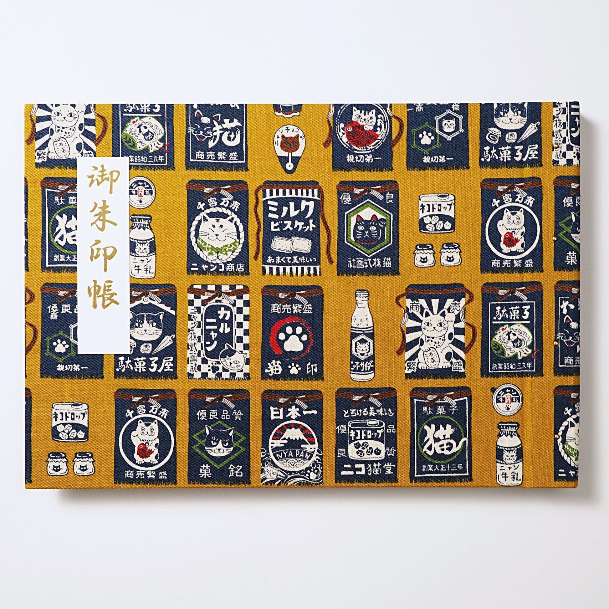 さまざまな猫モチーフの昔懐かしい駄菓子のイラストが散りばめられたデザインが目を引く御朱印帳です。