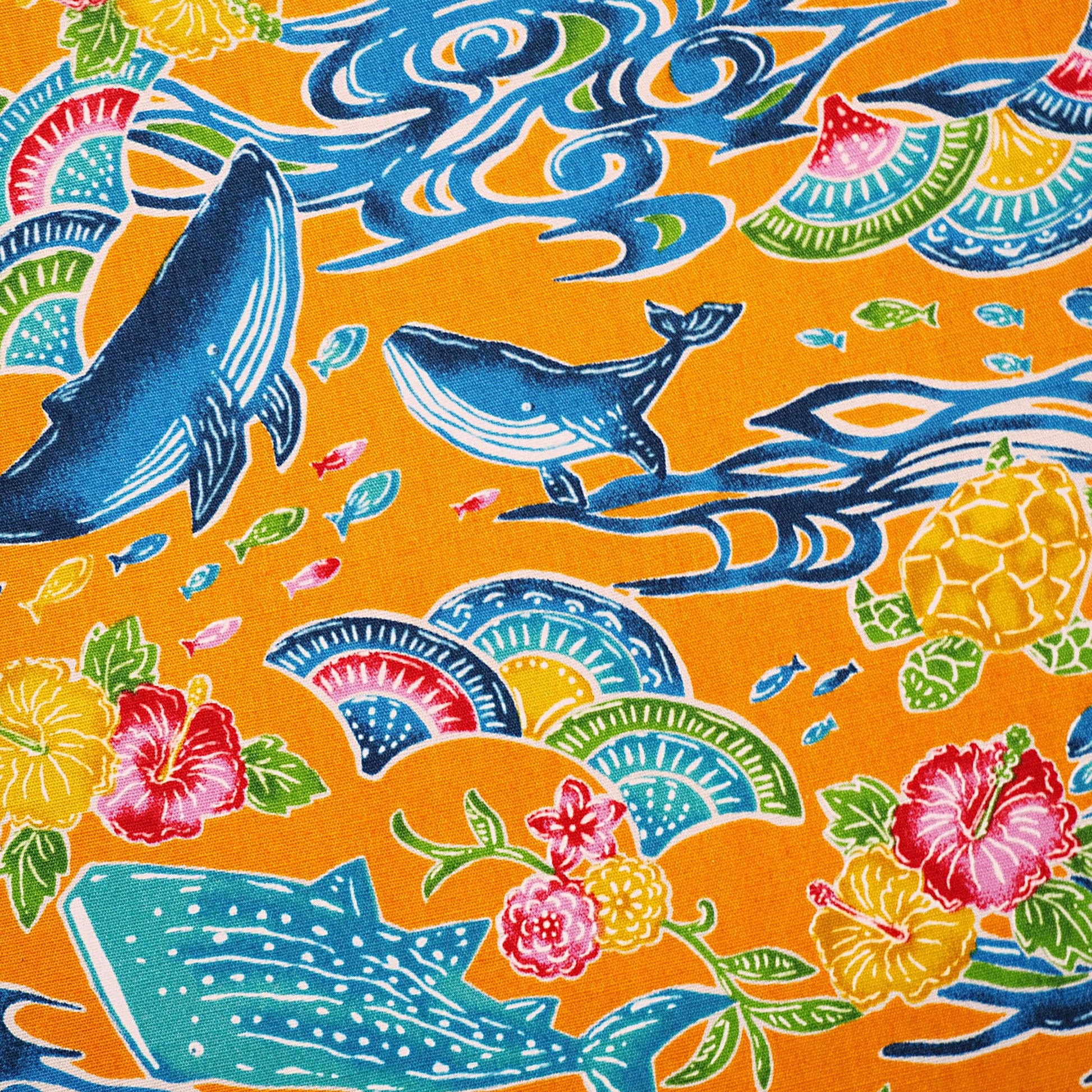 ハイビスカスや海のいきものたちがにぎやかにあしらわれた柄は沖縄の伝統的な染物「紅型(びんがた)」を思わせる、色鮮やかで心が弾むようなデザイン。