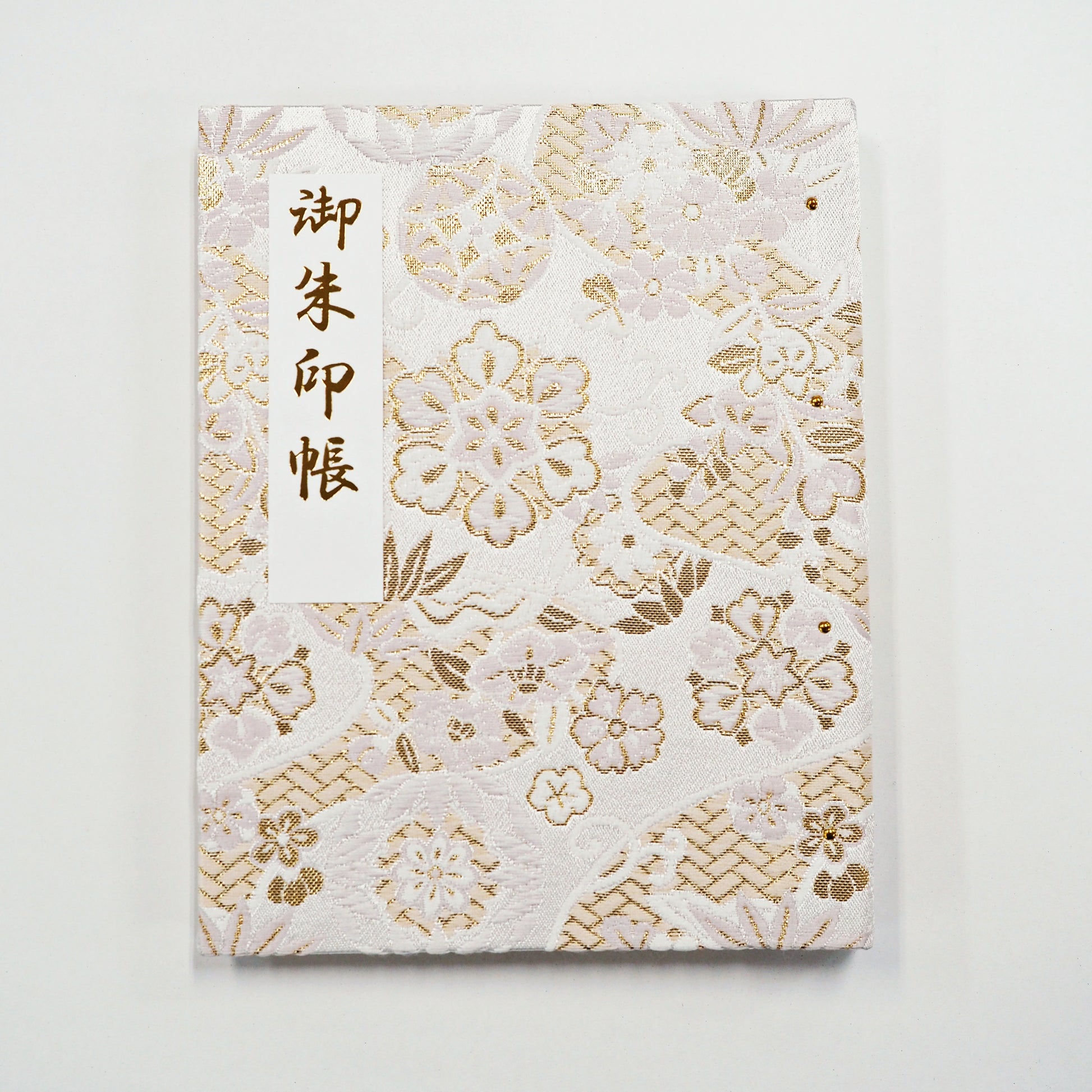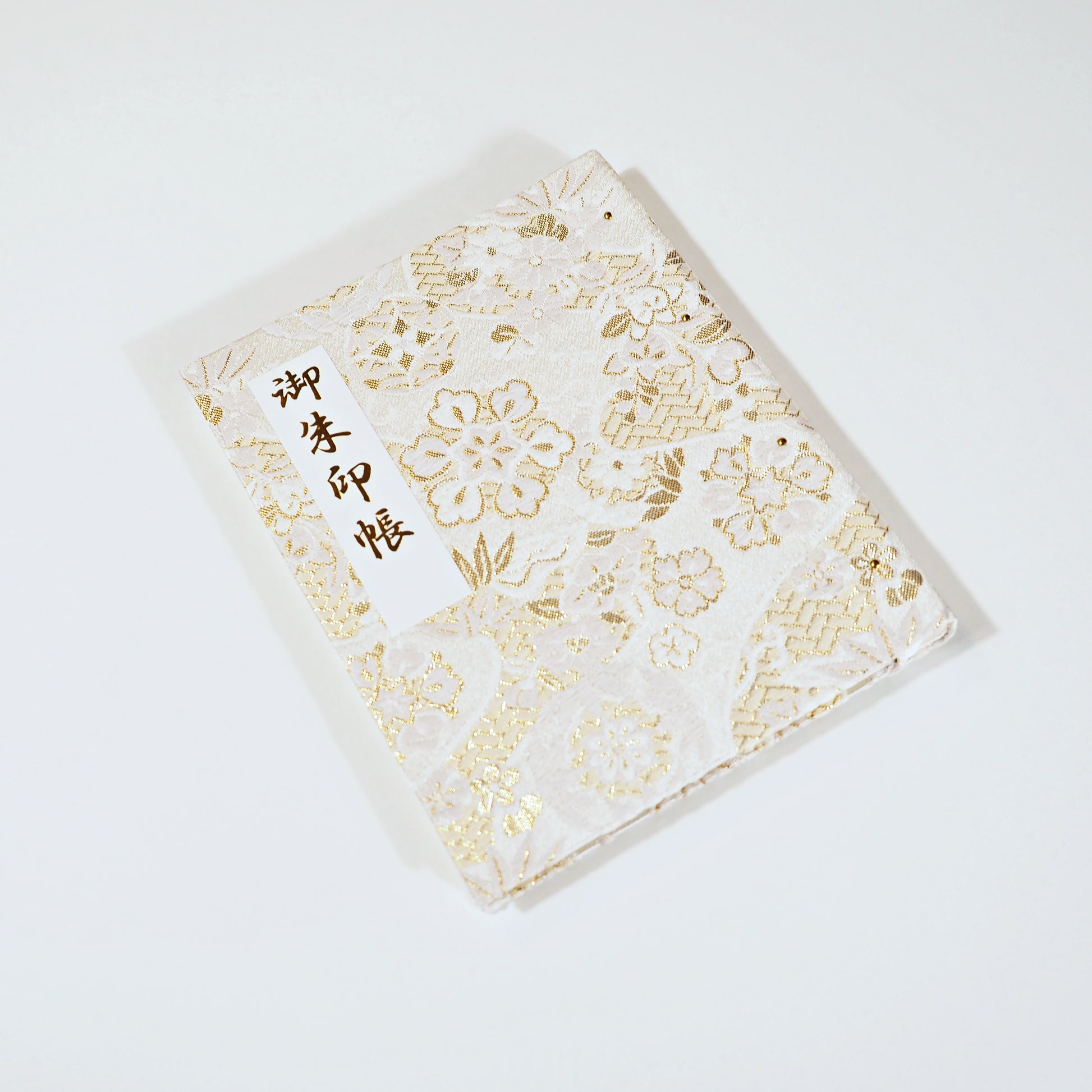 白地の清らかさと、金の輝きが融合したデザインは、古典的な美しさと力強さが感じられる西陣織を使用した一冊です。