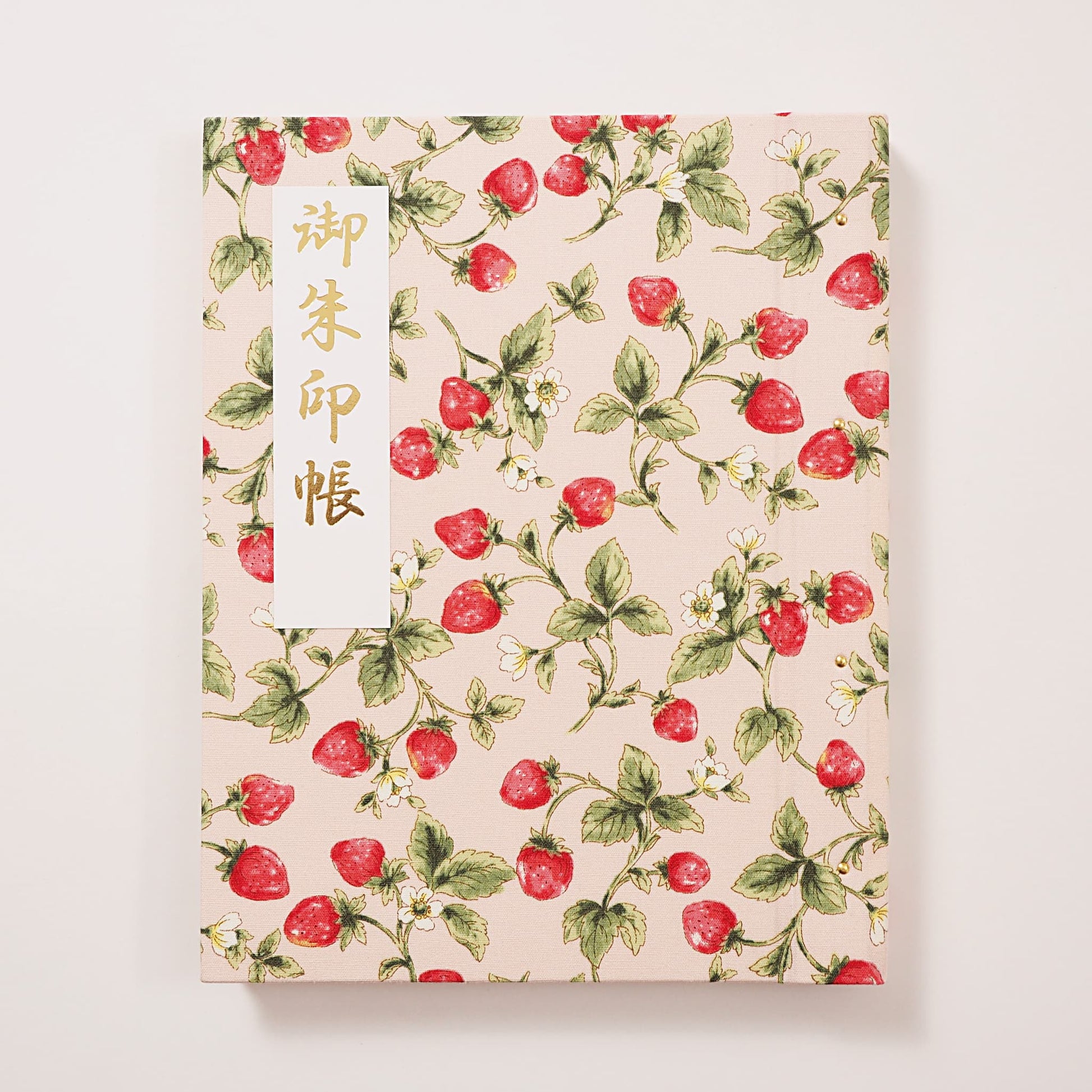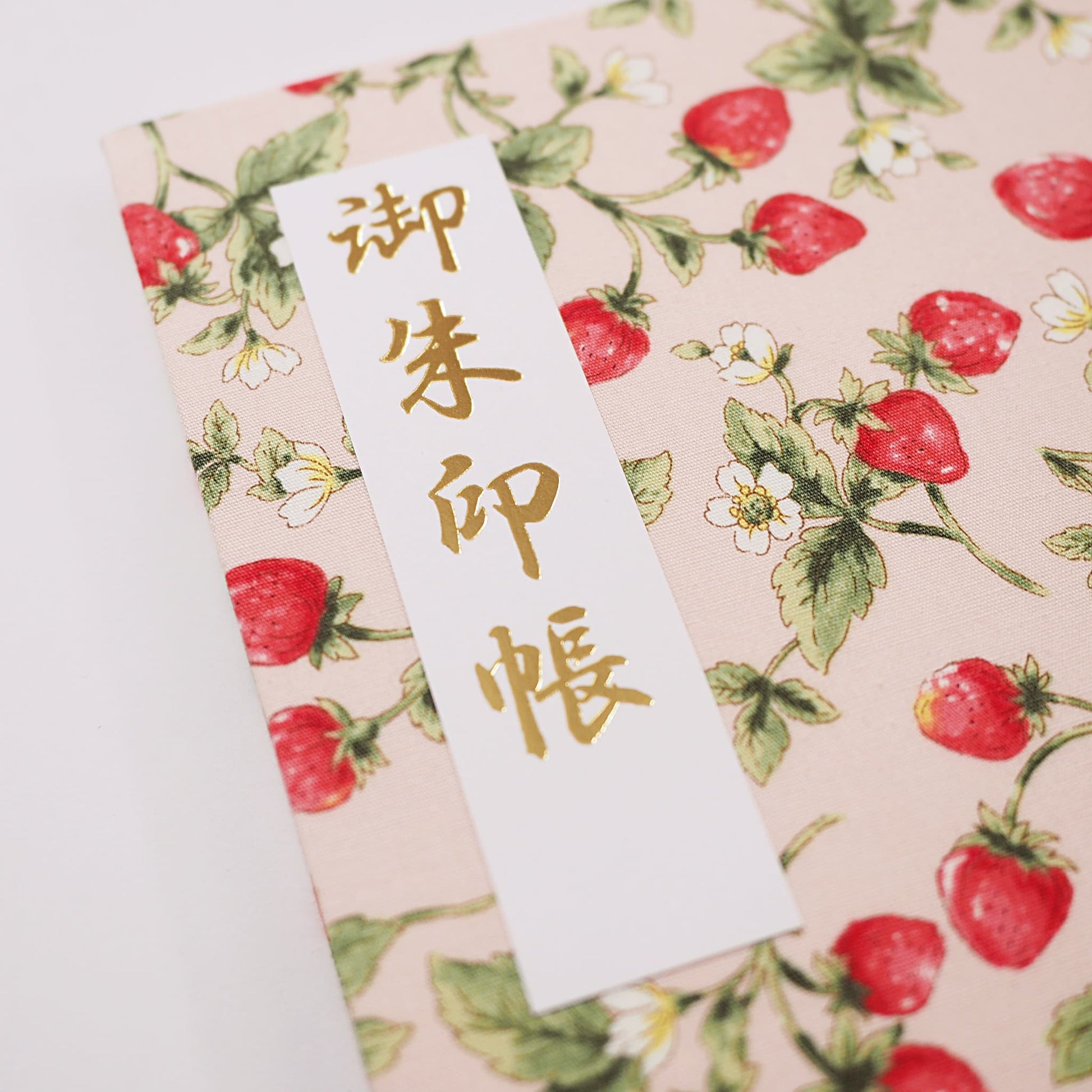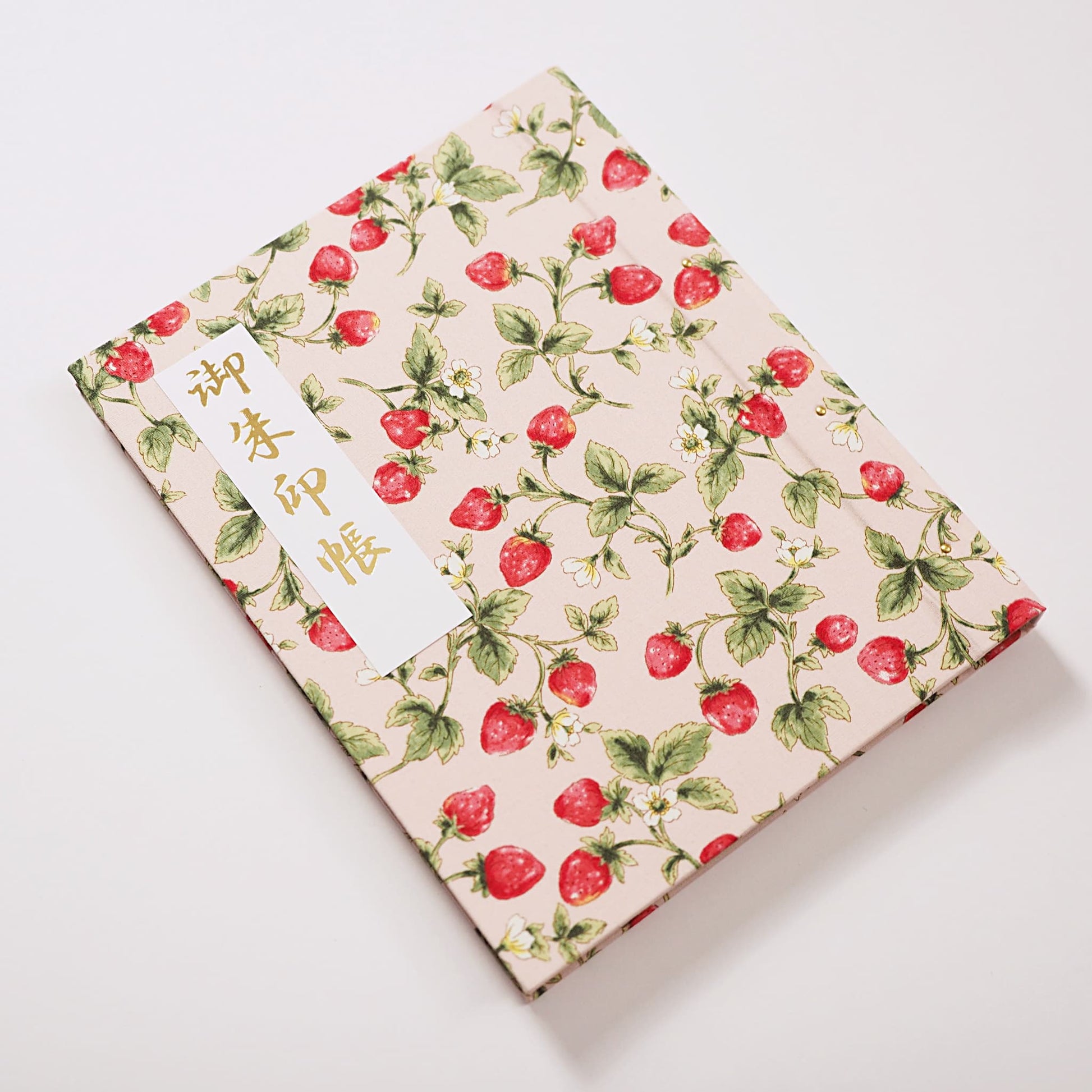 みずみずしい苺と白い花が繊細に描かれた、上品で大人可愛い御朱印ホルダーです。