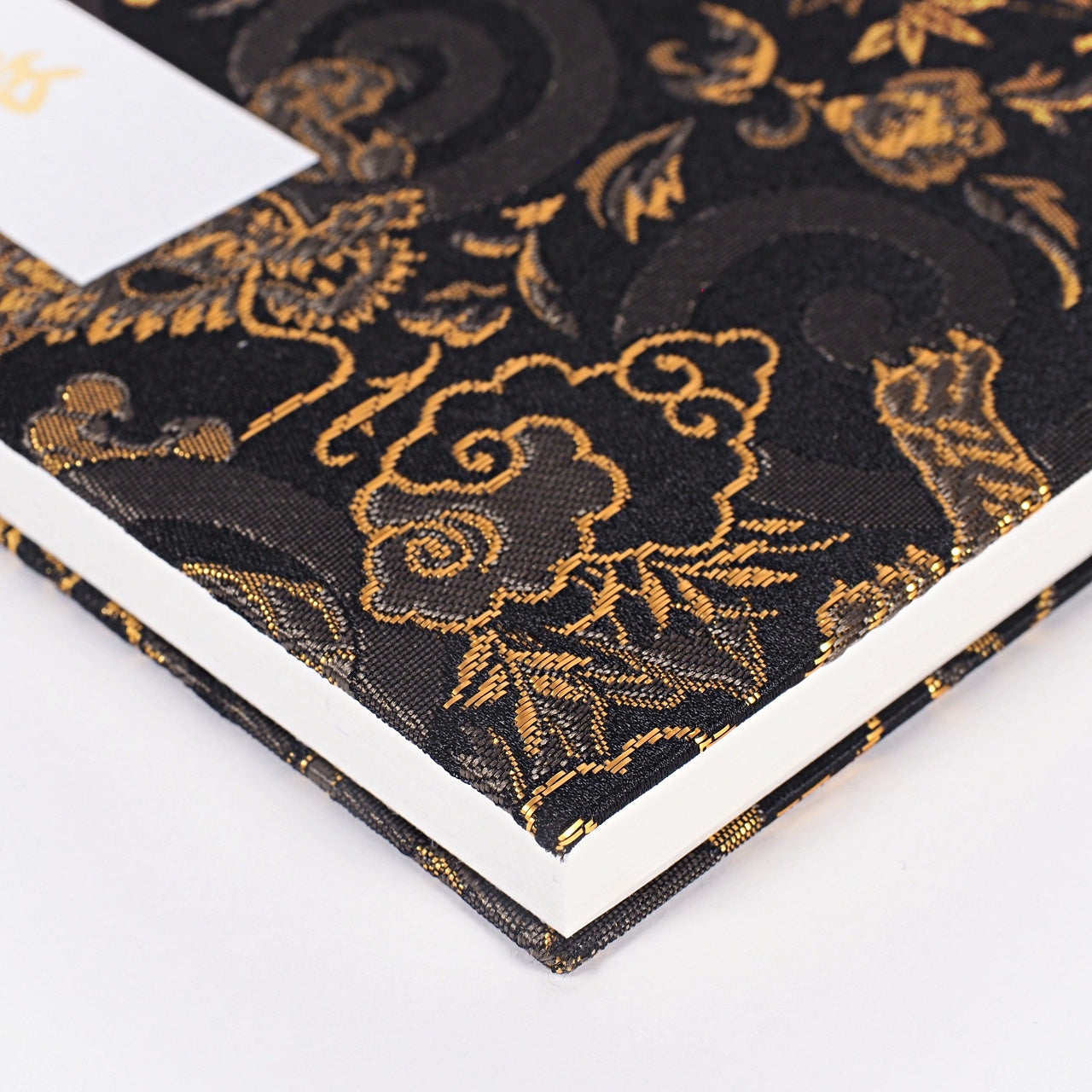 金糸を贅沢に使用した金襴生地の御朱印帳です。 幾重にも巻いた渦巻き模様を覆うように対峙している龍と虎が勇ましく、 黒地に金の装飾がより力強さを引き立たせる一冊です。