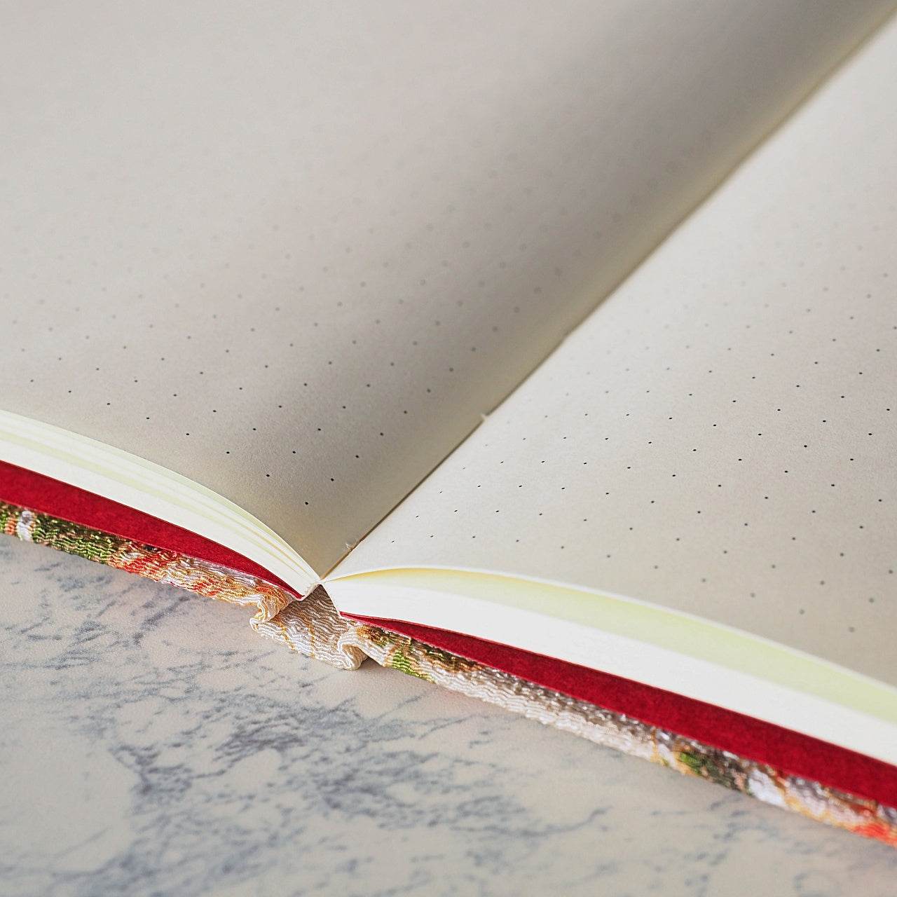 表紙に布生地を使用した、上品な手触りの上製本(ハードカバー)ノート。 丈夫な糸かがり綴じの本文は180度近く開くことができるので、書きやすく読みやすい仕上がりに。