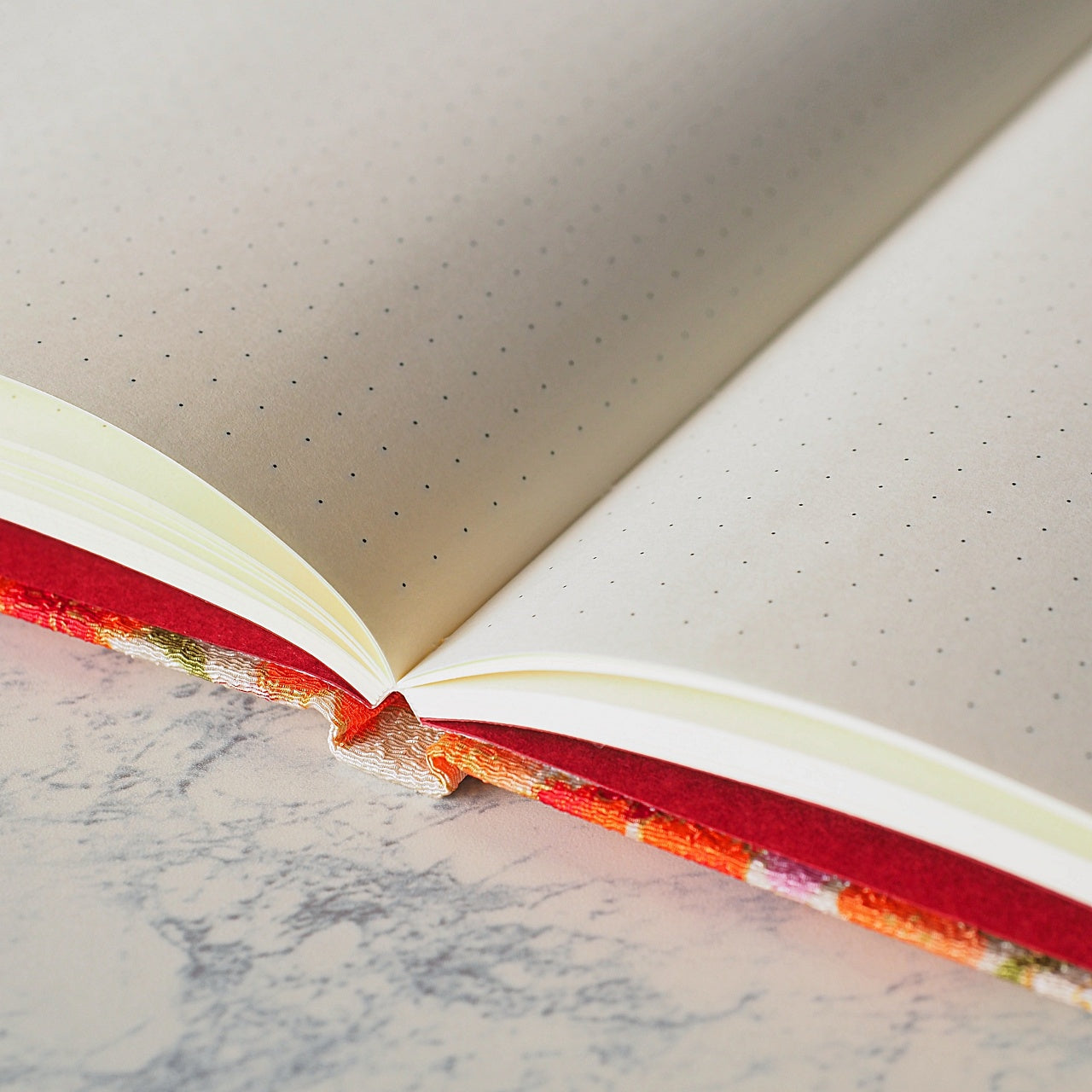 用紙には書き心地も滑らかで裏移りのしにくい、目に優しいクリーム色の書籍用紙を使用。 和×モダンを感じる松葉色のドット方眼が、そっと上品で落ち着いた雰囲気に引き立てます。