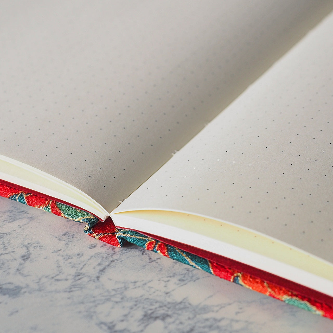 用紙には書き心地も滑らかで裏移りのしにくい、目に優しいクリーム色の書籍用紙を使用。 和×モダンを感じる松葉色のドット方眼が、そっと上品で落ち着いた雰囲気に引き立てます。