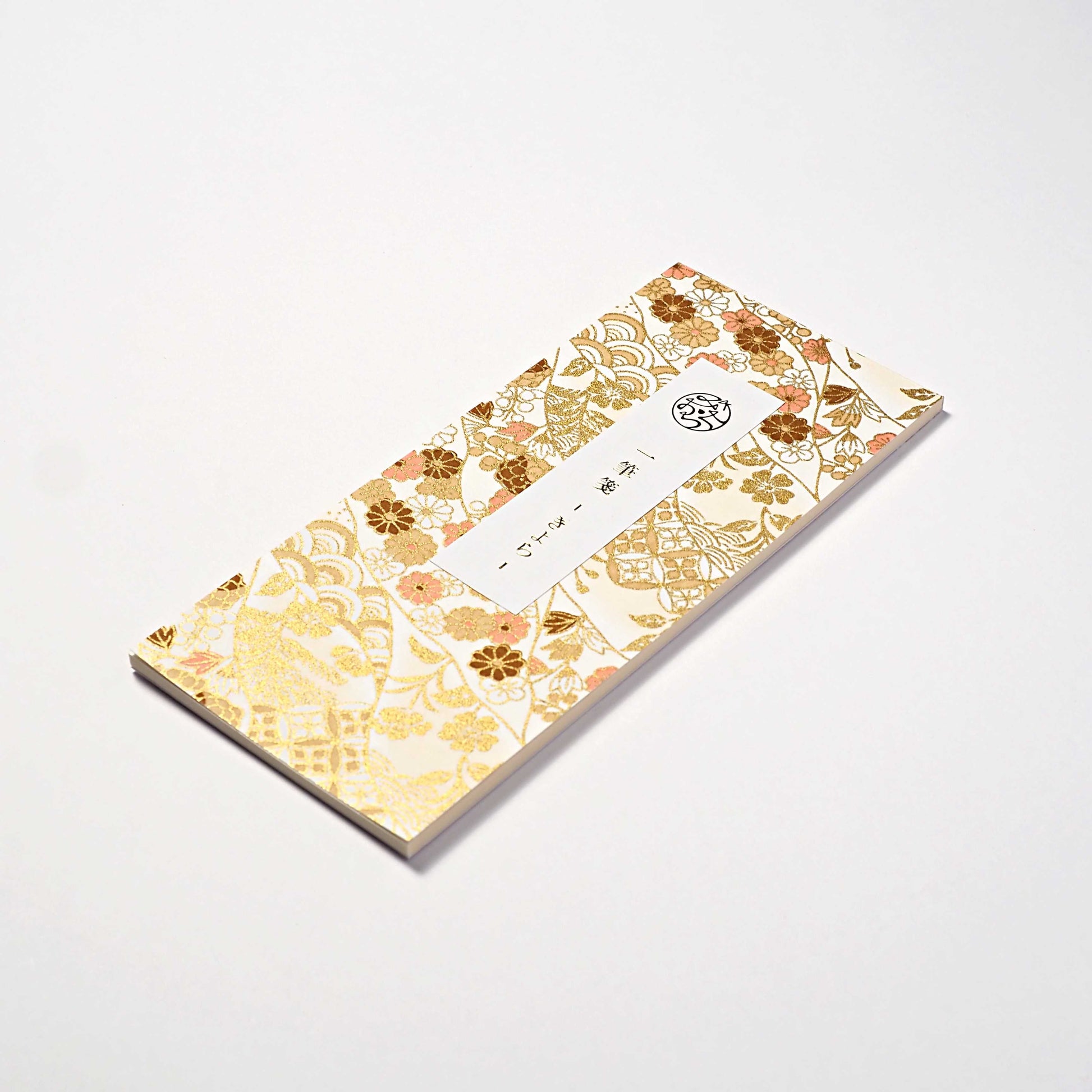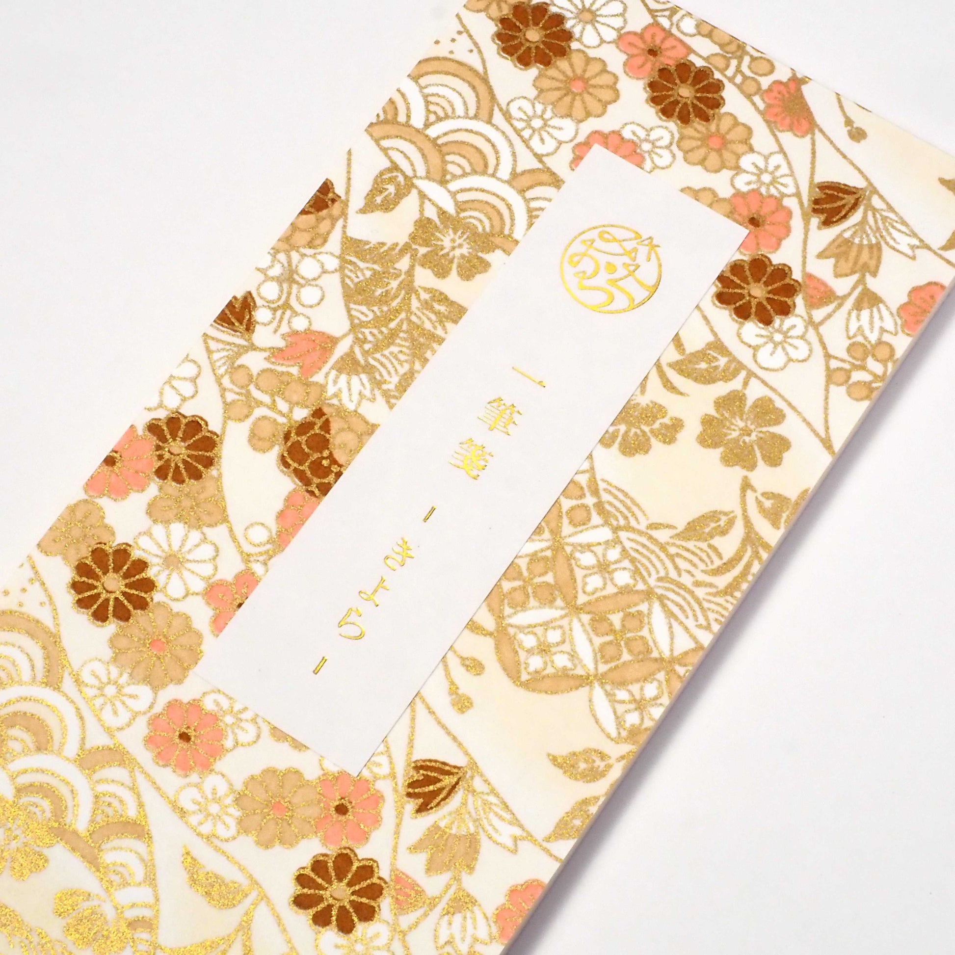 本文用紙には、流れるような繊細な模様とさらりとした手触りが特徴の和紙【うづき紙】を使用。 書き心地も滑らかで、きなり色と調和する模様は一見シンプルに見えますが、光に当たるときらめきが増し、奥深い美しさを感じさせます。